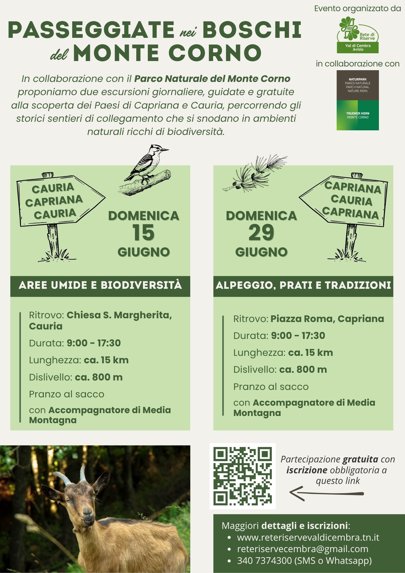 In collaborazione con il Parco Naturale del Monte Corno proponiamo due escursioni giornaliere, guidate e gratuite alla scoperta dei Paesi di Capriana e Cauria, facce della stessa montagna, accumunate da storia e tradizioni, come si intuisce facilmente dai loro nomi.