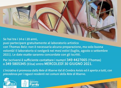 La Rete di Riserve Val di Cembra Avisio organizza una serie di incontri laboratoriali rivolti a ragazzi tra i 14 e i 20 anni per la realizzazione di 2 murales a tema ambientale (uno a Cembra e uno a Segonzano), con la guida dell'artista Thomas Belz.