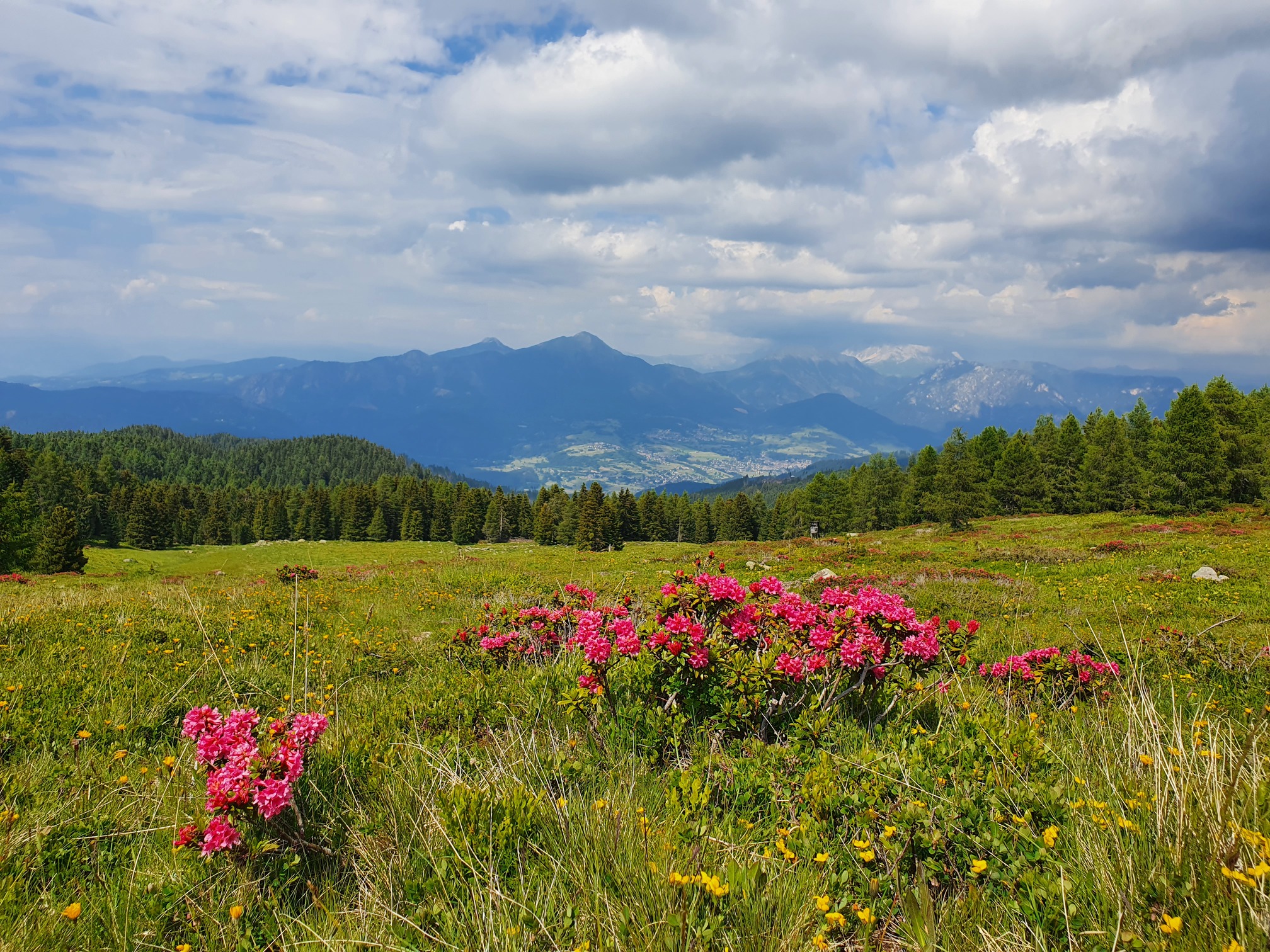 Dopo esserci rifocillati alla Malga Sass proseguiamo il nostro itinerario verso i “Pradi da le fior” seguendo la strada pianeggiante che parte in prossimità della malga. Questo alpeggio custodisce un’eccezionale vista sulla Val di Fiemme, dal paese de Le Ville (Carano, Daiano, Varena) fino al Corno Nero e la Pala di Santa. Posto a 2000 metri, è un autentico balcone fiorito, ricco di rododendri, dove tutto invoglia a una sosta.