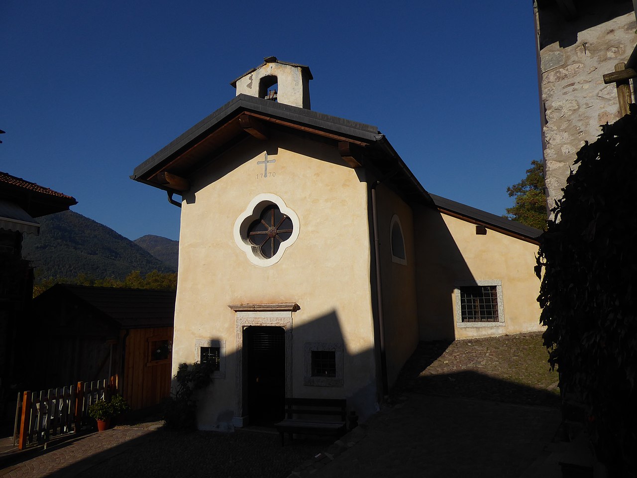Per riprendere il nostro percorso, risaliamo per un breve tratto lungo il sentiero che porta alla Centrale, fino a una casa isolata, sopra la quale si imbocca sulla sinistra il sentiero SAT E463 che sale alla frazione di Piazzole, un borgo molto ben curato, adornato di piante e fiori. Nel paese c’è una caratteristica chiesetta del ‘700 intitolata a San Giobbe, il santo della pazienza, protettore dei campi e dei bachi da seta. Un tempo la bachicoltura era una risorsa importante per la sussistenza economica anche nelle più piccole valli trentine.