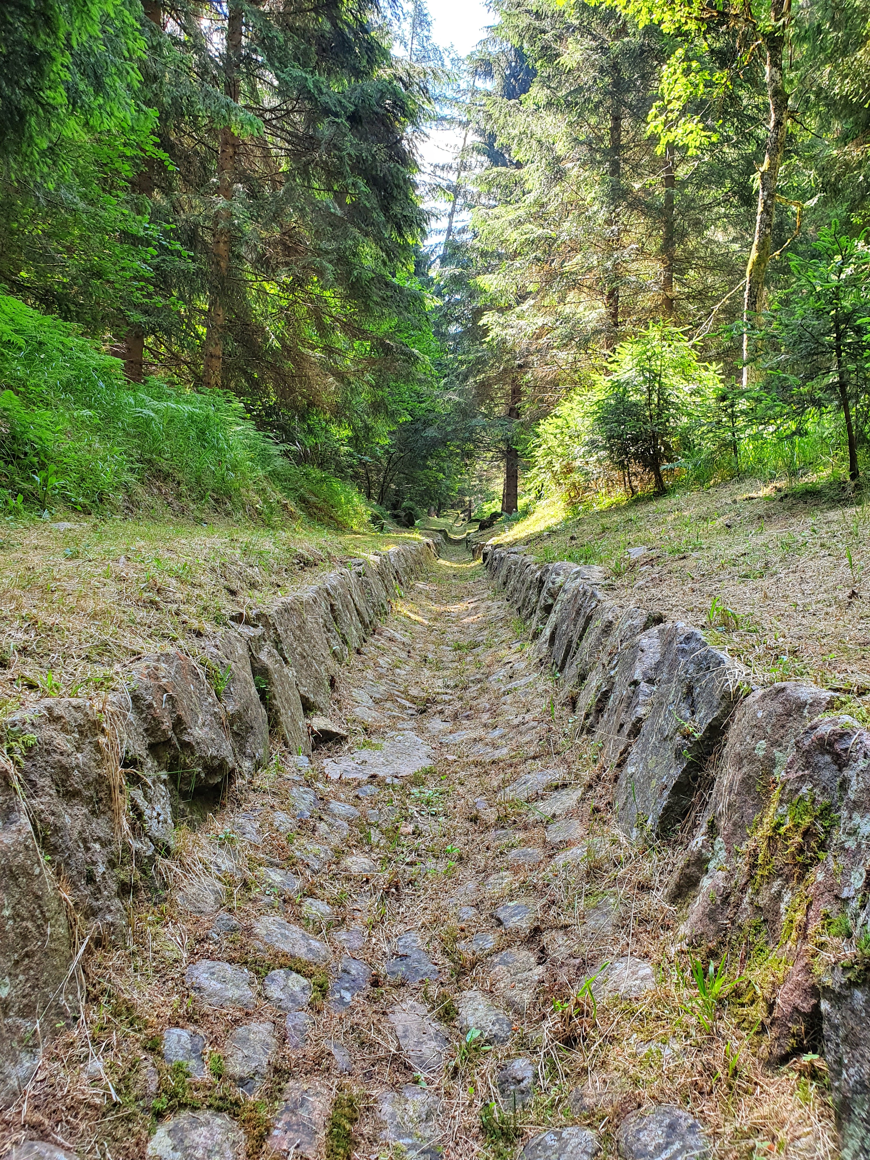 Da Monte Alto prendiamo il sentiero che, attraversando boschi silenziosi, ci riporta verso il territorio di Valfloriana. A Valfloriana il legame con il bosco è da sempre particolarmente profondo. Oltre ai maestosi boschi che qui disegnano il paesaggio, ce lo dimostra un'importante testimonianza storica: la Cava de le Bore. Si tratta di un antico manufatto in sasso, un canalone pendente lastricato in pietra, che i boscaioli utilizzavano per portare a valle il legname tagliato nei boschi in quota. Un lavoro particolarmente pericoloso, ma fondamentale per questa piccola comunità montana. La Cava de le Bore di Valfloriana fu distrutta dall'alluvione del 1966 ma grazie a un importante lavoro di recupero dell'amministrazione comunale possiamo ancora oggi ammirare questa preziosa opera dell'ingegno montano.